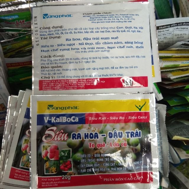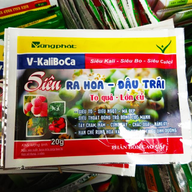 Phân bón cao cấp V-KaliBoCa với sự kết hợp của 3 siêu _ Siêu Kali - Siêu Bo - Siêu Calci giúp cho cây trồng Siêu ra hoa, đậu trái, to quả, lớn củ.- Siêu to, siêu ngọt, đẹp mã.