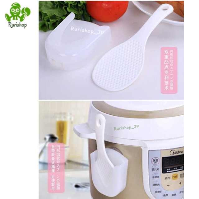- Công dụng: Muôi xới cơm được thiết kế đặc biệt để chống dính cơm. Giá đựng có hít chân không có thể hít dính vào nồi cơm.