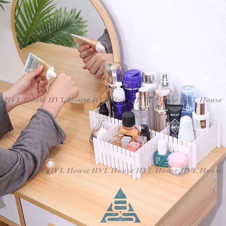 - Gồm nhiều khe gắn, độ dẻo cao cho bạn tự do sáng tạo thành những chiếc ngăn chứa độc đáo hoặc gắn thành 1 chiếc khay để bàn tiẹn lợi dùng để đựng cà vạt, đồ lót, mỹ phẩm, dụng cụ học tập,… trông thật gọn gàng và bắt mắt.