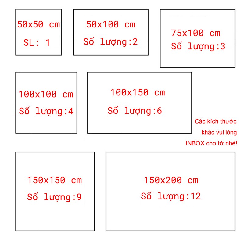 Vd như bạn mua 2 tấm 50x50 thì mình sẽ để nguyên cả thành tấm 50x100 cm. Tương tự nếu chọn mua 3 cái thì mình để nguyên là 75x100. Không cắt lẻ mà để nguyên thành tấm lớn nhé khách.