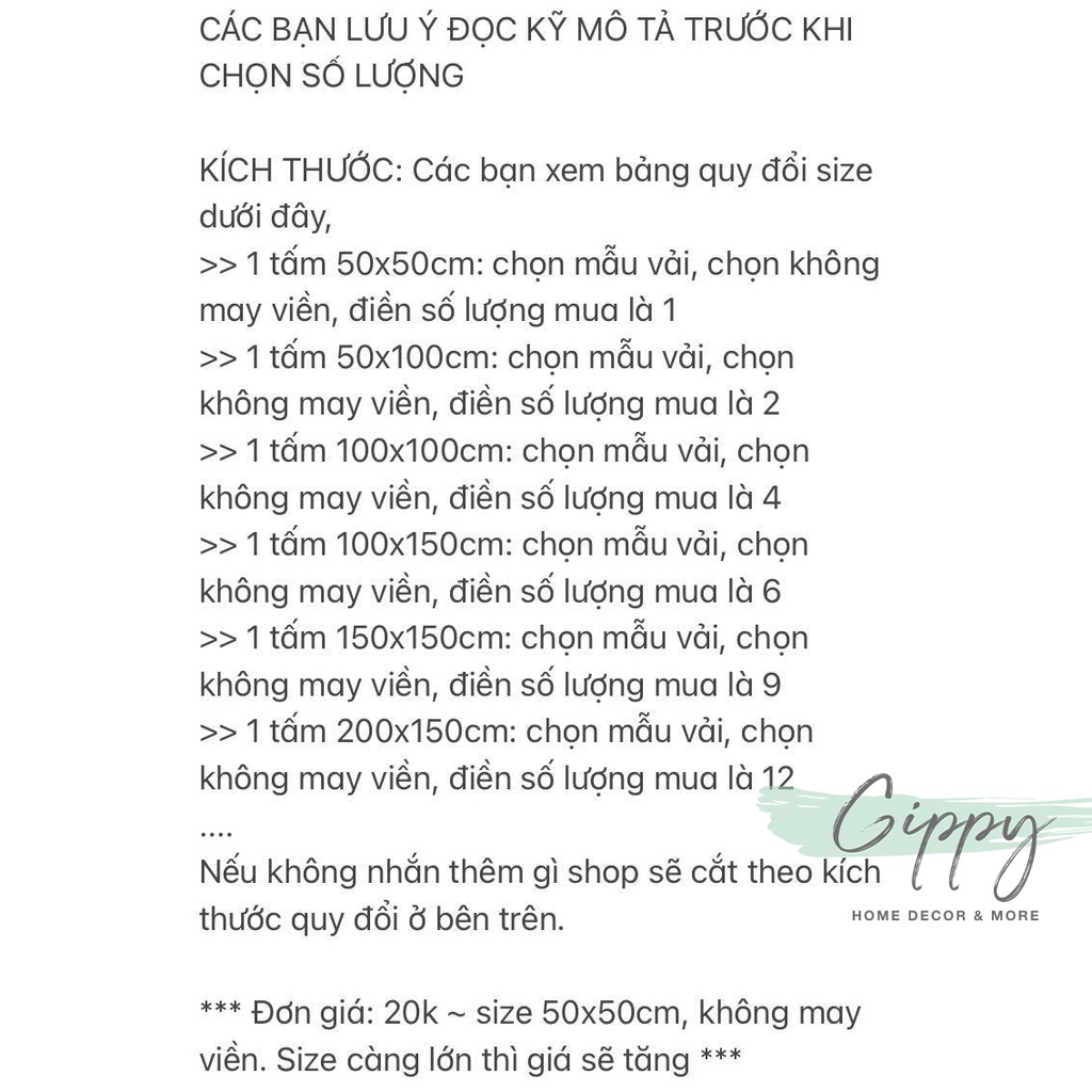 >> 1 tấm 50x50cm: chọn mẫu vải, chọn may/không may viền, điền số lượng mua là 1