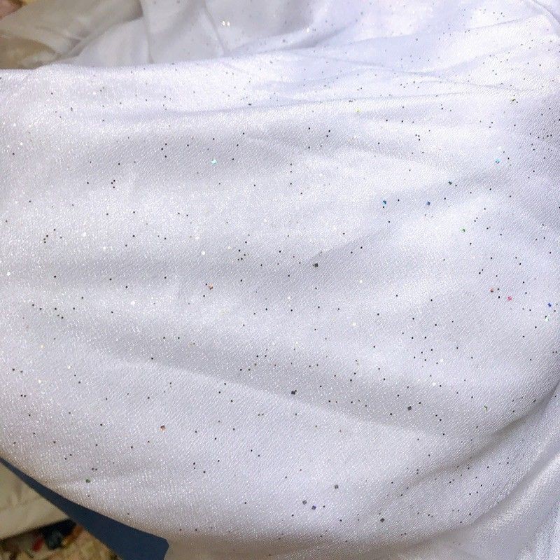 Vải voan trắng có kim tuyến, 1 mặt có kim tuyến, 1 mặt trắng trơn.