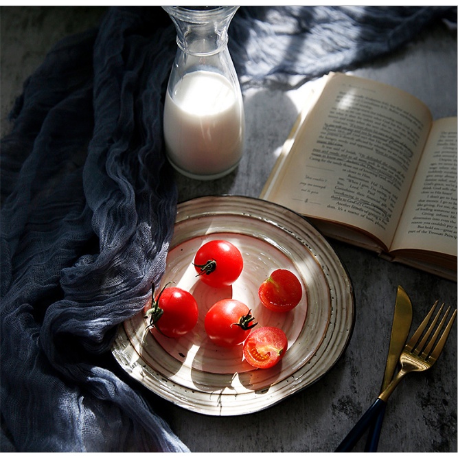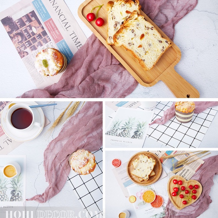 Tấm vải voan lưới mỏng hơi nhăn là một phụ kiện không thể thiếu trong chụp ảnh đồ ăn, bánh, trái cây,.... Nó dễ dang kết hợp để chụp phong cách vintage hay cả phong cách hiện đại.Mẹo nhỏ là bạn nên kết hợp vải voan lưới với những món phụ kiện khác nhau như: Dĩa, muổng,…Các loại nền như nền gỗ, nền đá Marble, nền gạch xi măng.