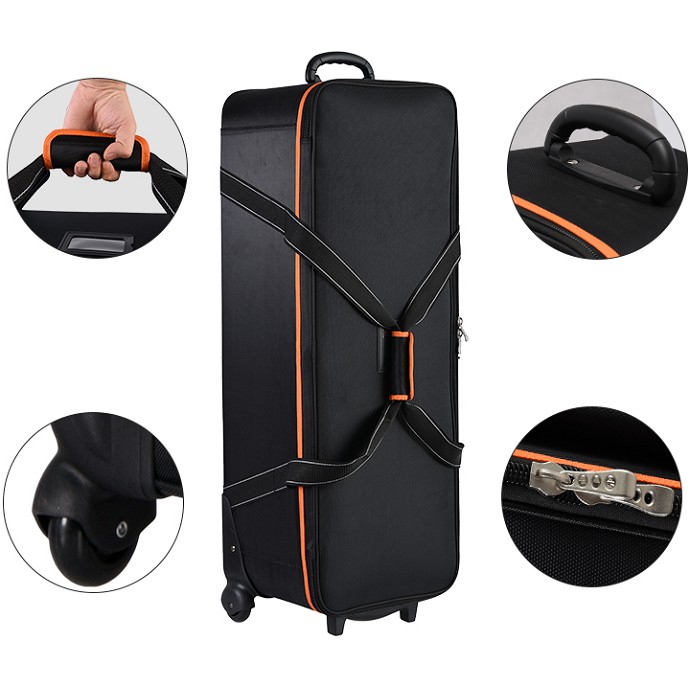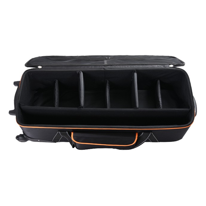 Vali đựng đèn và phụ kiện studio được kế bằng vải và nhựa ABS cứng cáp có tay kéo và bánh xe di chuyển tiện dụng. Khoang túi rộng có thể để các thiết bị quay phim chụp ảnh như đèn flash, đèn led video, softbox, chân đèn, chân máy ảnh… Ngoài ra bên trong ngăn vách với bốn ngăn cấu hình cho phép bạn sắp xếp cho phù hợp với thiết bị cụ thể.THÔNG SỐ KỸ THUẬT: