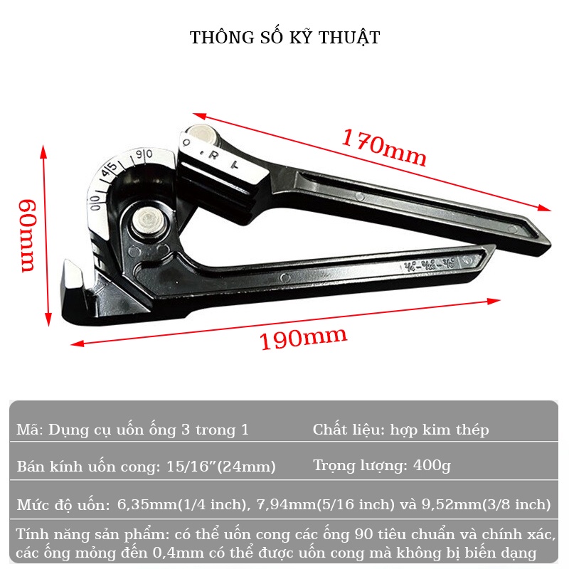 • Mức độ uốn: 6.35mm(1/4 inch), 7.94mm(5/16 inch) và 9.52mm(3/8 inch).