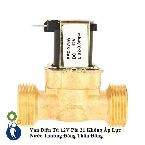 Van Điện Từ 12V Phi 21 Không Áp Lực Nước Thường Đóng Thân Đồng