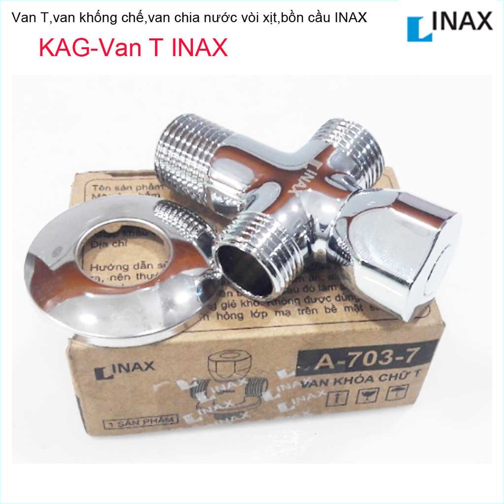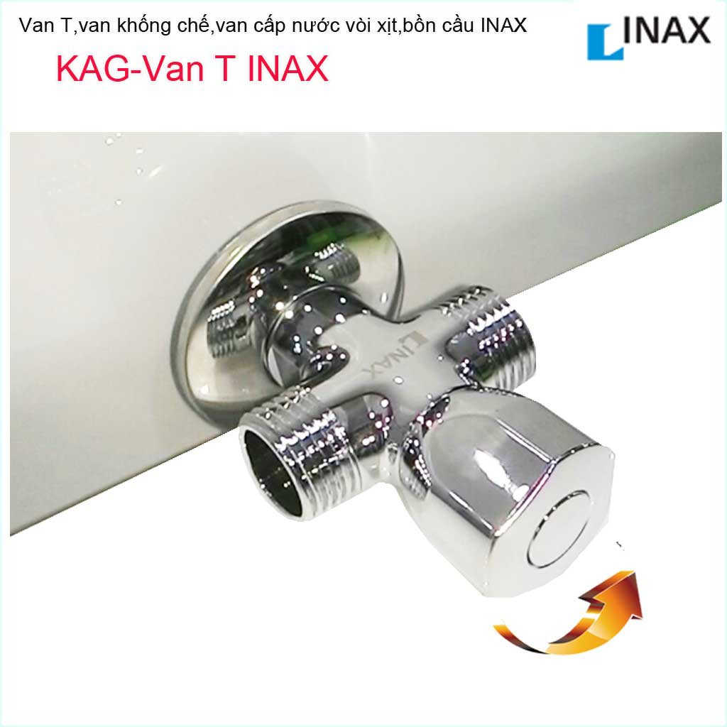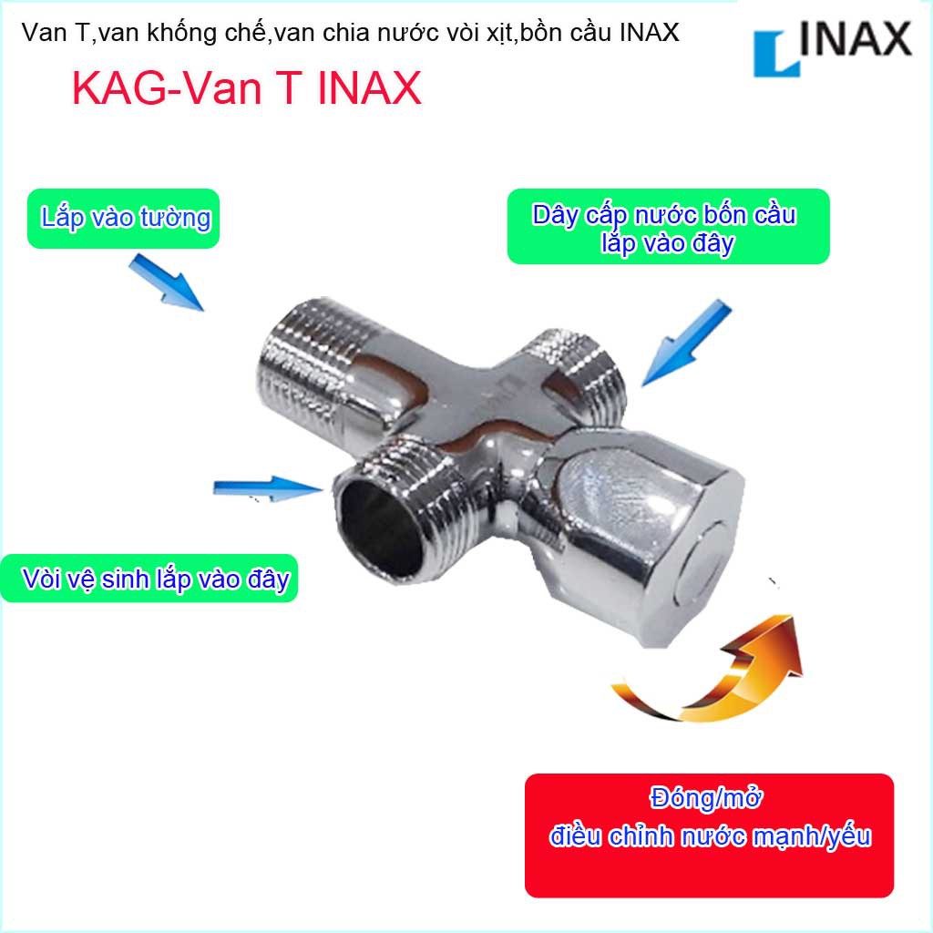 Van giảm áp lực nước chữ T , van vòi Inax KAG-Van T Inax sử dụng để làm giảm áp lực nước cho vòi nước và bàn cầu, van vòi Inax KAG-Van T Inax sử dụng để chia nước từ 1 nguồn nước trong tường chia thành 2 nguồn nước: 1 nguồn gắn với vòi xịt, 1 nguồn gắn với dây cấp nước cho bồn cầu, van vòi Inax KAG-Van T Inax dùng nối với đầu chờ ren ngoài D21( đường kính 2.1cm)