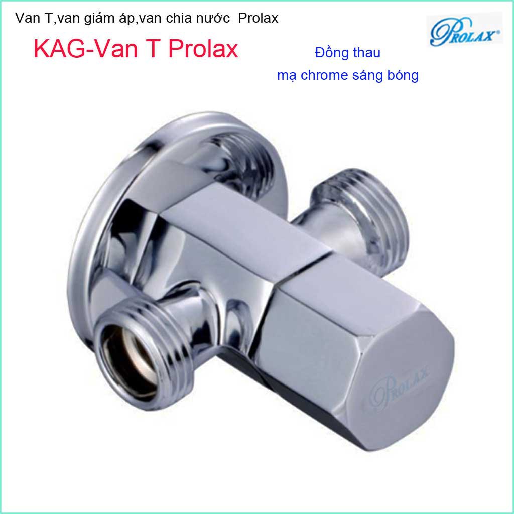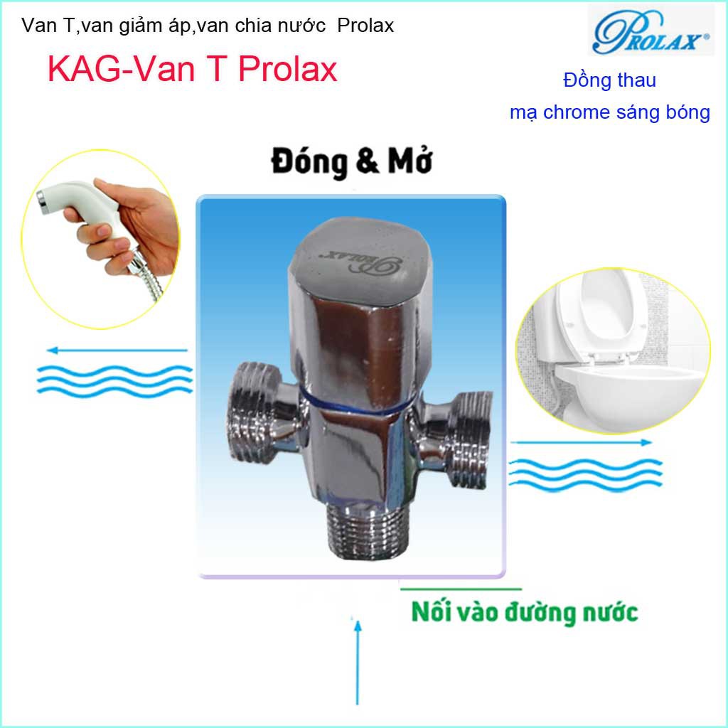 Van giảm áp lực nước chữ T , van vòi Prolax KAG-Van T Prolax sử dụng để làm giảm áp lực nước cho vòi nước và bàn cầu,van vòi Prolax KAG-Van T Prolax sử dụng để chia nước từ 1 nguồn nước trong tường chia thành 2 nguồn nước: 1 nguồn gắn với vòi xịt, 1 nguồn gắn với dây cấp nước cho bồn cầu, van vòi Prolax KAG-Van T Prolax dùng nối với đầu chờ ren ngoài D21( đường kính 2.1cm)