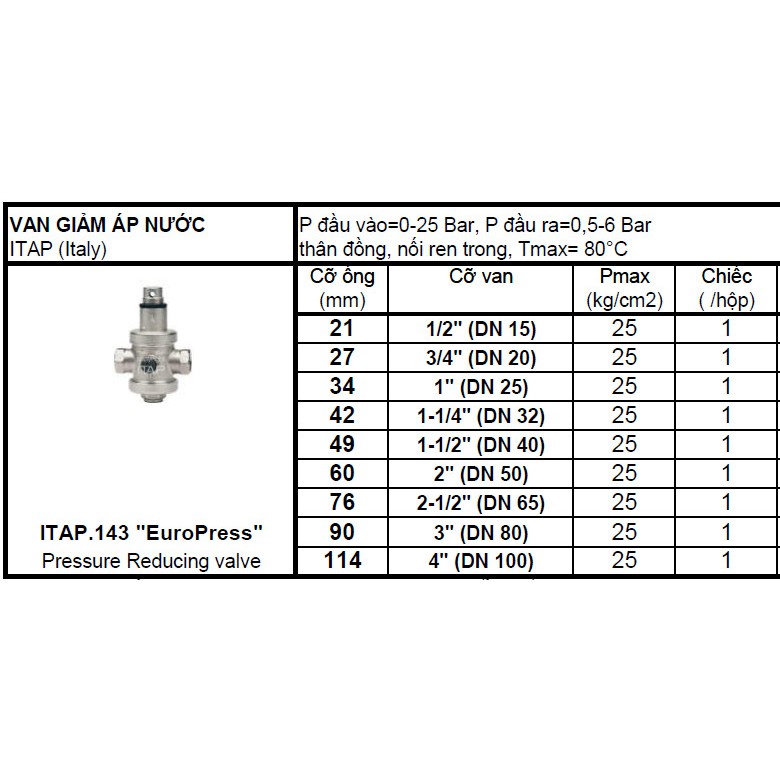 Giới thiệu Van Giảm áp nước art.143 Itap (Italy) van điều áp Itap phi 21 phi 27 phi 34 áp 25kg