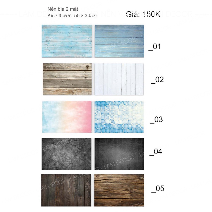 Bạn thỏa thích biến tấu nhiều concept khác nhau với 11 mẫu phông nền chụp ảnh giả gỗ thời thượng vân sọc, vân gỗ ép, vân đá…. từ tông sáng đến tông nâu trầm.