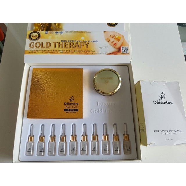 BỘ MẶT NẠ VÀNG LÁ 24K GOLD THERAPY LUXURY DESEMBRE HÀN QUỐCĐây là bộ sản phẩm vàng cao cấp duy nhất có đầy đủ combo sử dụng với hiệu quả cao nhất 100% đến từ Hàn Quốc với các thành phần nguyên liệu an toàn nhất. Làm đẹp từ vàng không còn là điều quá mới mẻ ở Việt Nam, nhưng, để được sử dụng vàng một cách nguyên chất nhất thì chỉ có bộ mặt nạ vàng lá 24k gold therapy luxury của hãng Desembre mới đáp ứng được.