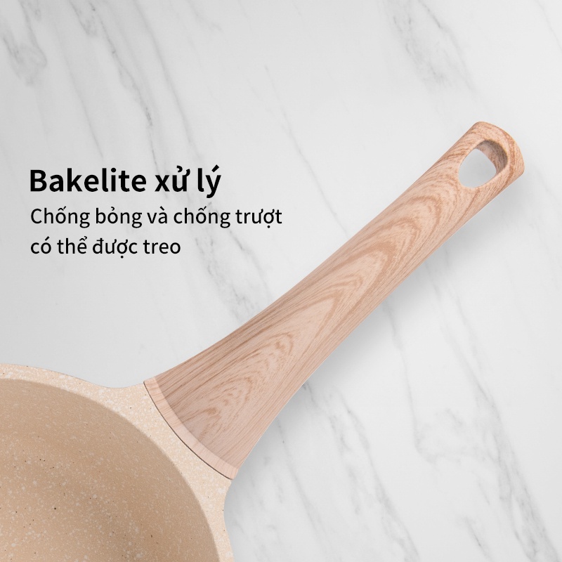 - Tay cầm bằng nhựa bakelite có thiết kế vân gỗ, tạo cảm giác thoải mái khi cầm và chống nóng trong khi nấu.