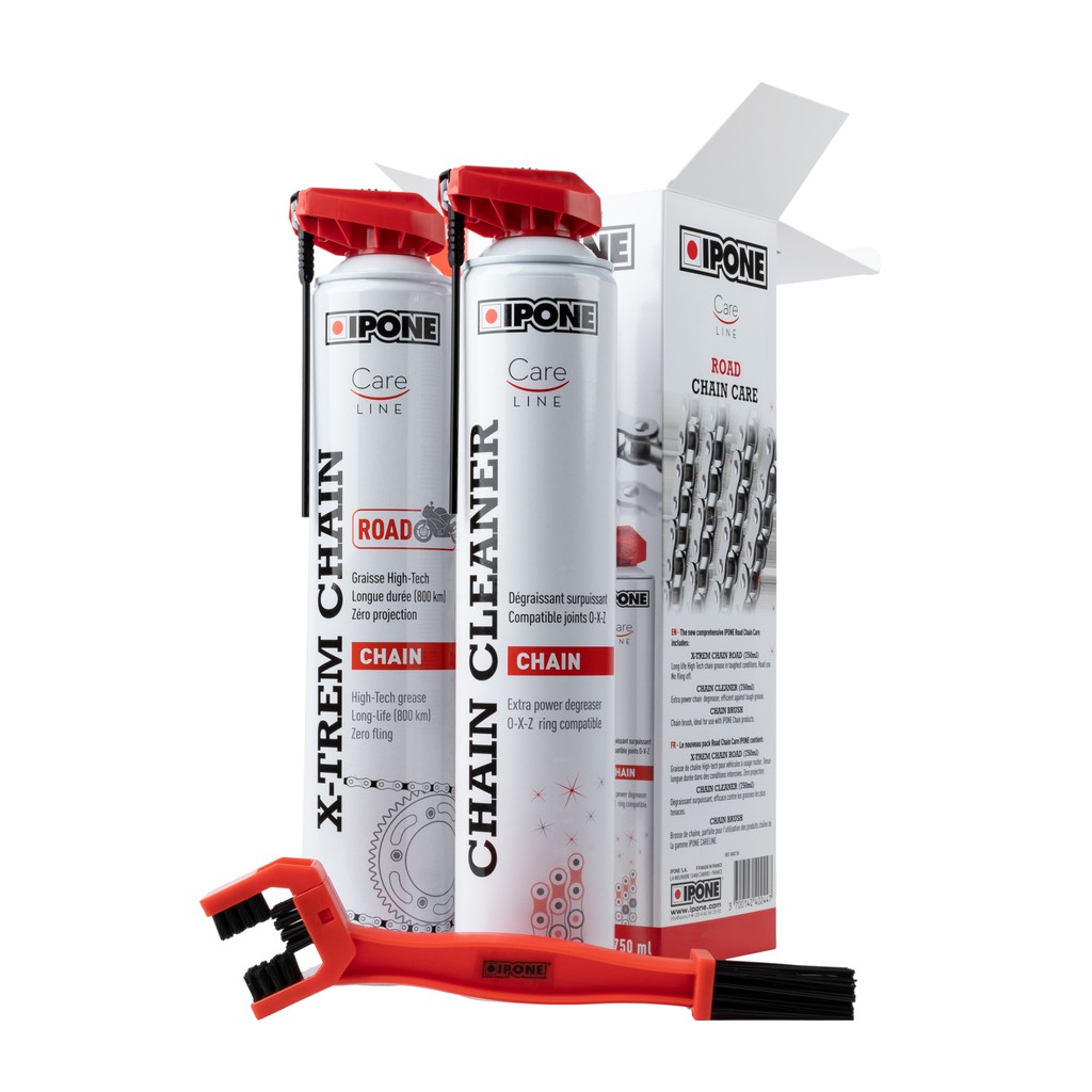 IPONE ROAD CHAIN CARE PACK là bộ sản phẩm để chăm sóc sên/xích. Nó có chứa chất tẩy rửa sên/xích hiệu quả chống lại các loại dầu mỡ cứng đầu nhất, đi kèm với chổi xích và chất bôi trơn xích đường dài - bám dính 800 km - trong điều kiện khắc nghiệt.Với IPONE ROAD CHAIN CARE PACK, bạn sẽ có mọi thứ cần thiết để làm sạch và bảo trì sợi sên/xích của mình.