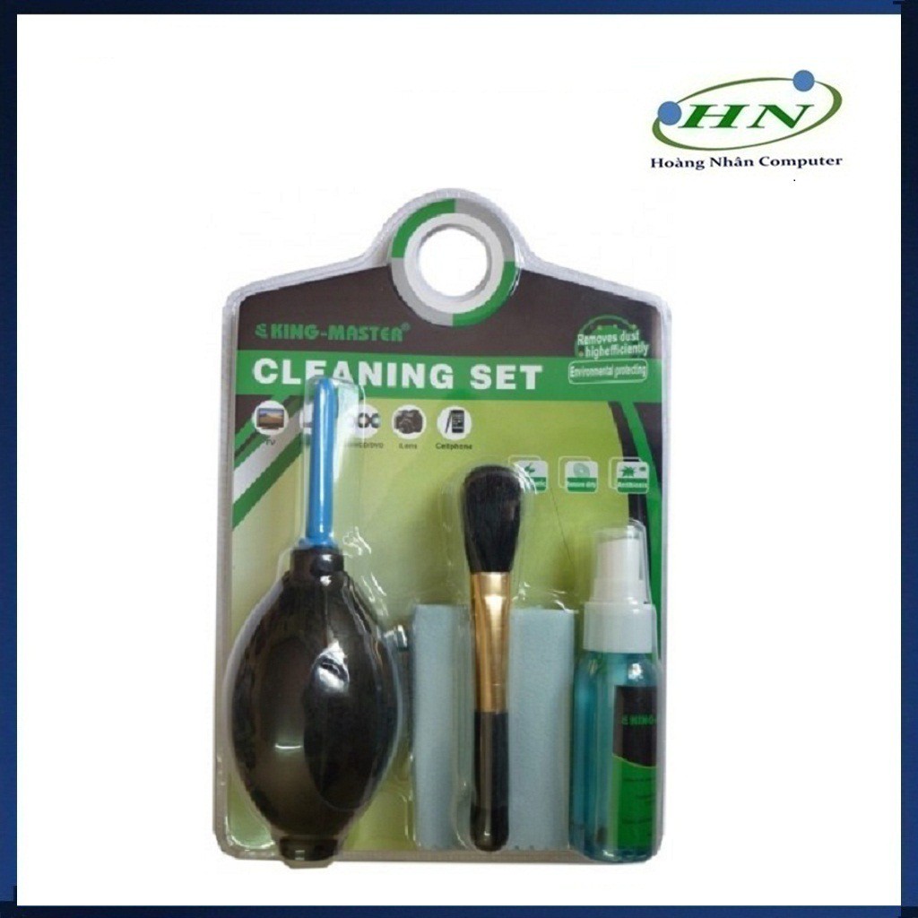 Bộ dụng cụ gồm 6 món: dụng cụ thổi bụi, chổi quét, nước lau màn hình, khăn lau, giấy thấm màn hình, tâm bông sẽ giúp chiếc laptop luôn sạch sẽ như mới.