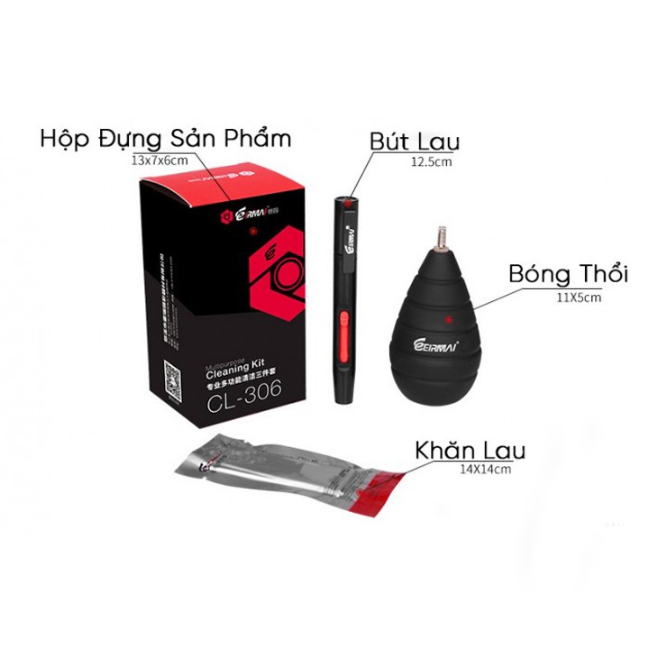 Bộ sản phẩm có màu đỏ đặc trưng của Canon bao gồm bóng thổi bụi, chổi lông 2 đầu quét lens, Khăn lau len, giấy lau len, bông tăm 100% cotton lau các góc cạnh sensor, gương lật ...