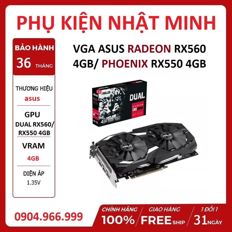 VGA Card màn hình Asus DUAL RADEON RX560 4GB/ Asus PH RX550 4GB hiệu năng ngang 1050 full box nguyên seal BH 36 tháng