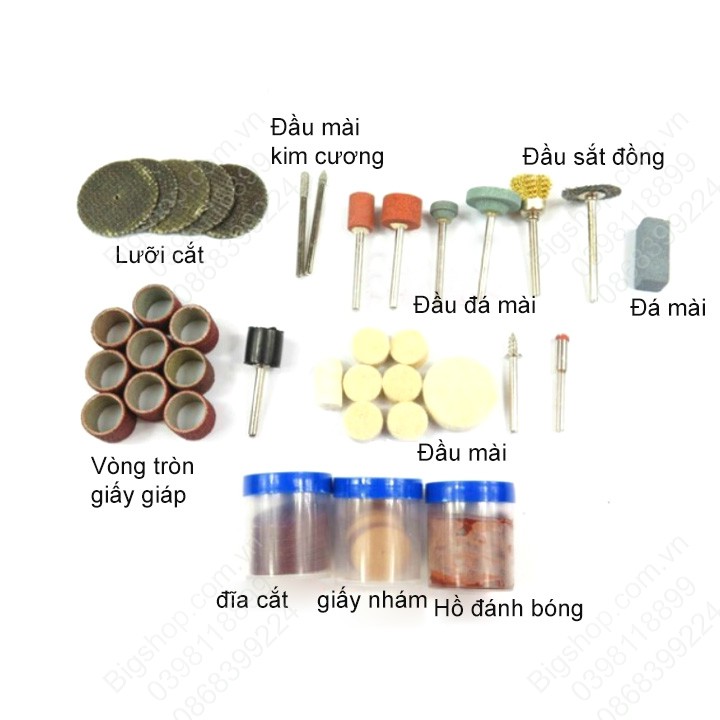* Bao gồm dụng cụ đánh bóng, miếng đệm, đĩa cắt, con lăn, đĩa mài, đĩa,...