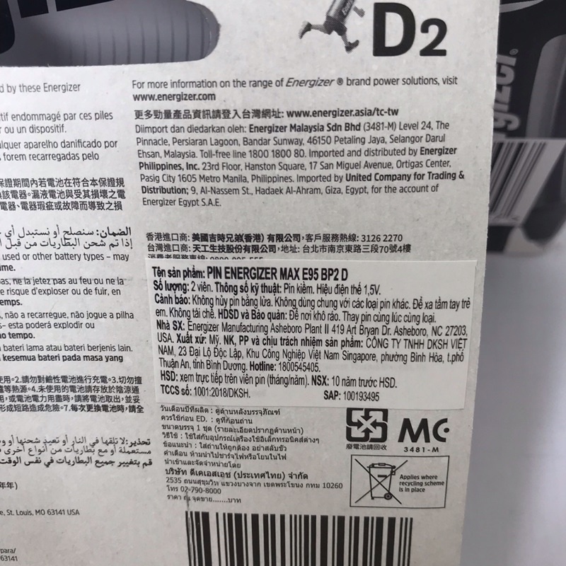Giới thiệu Vĩ 2 viên Pin ĐẠI (D) 1,5V ENERGIZER MAX E95 BP2D Alkaline Kiềm cho thiết bị đánh lửa Bếp Ga, Đèn pin, thiết bị công n