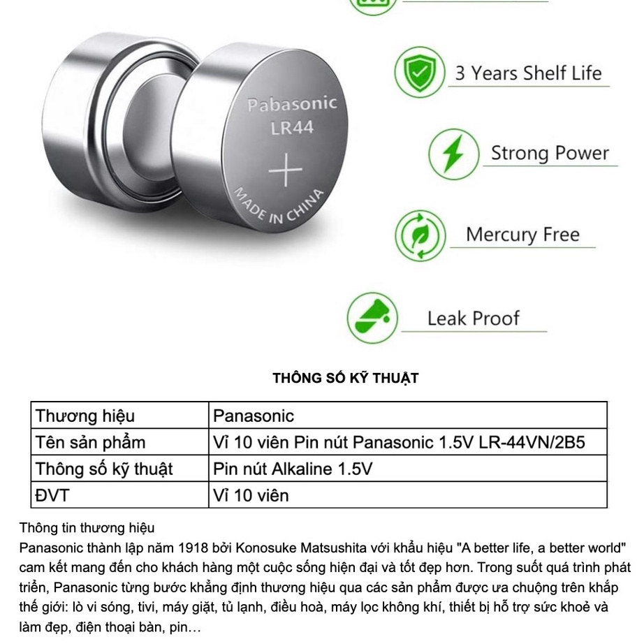 Vỉ 2 Viên Pin Nút Alkaline Panasonic LR-44VN/2B -1.5VPin chính hãng thương hiệu Panasonic.