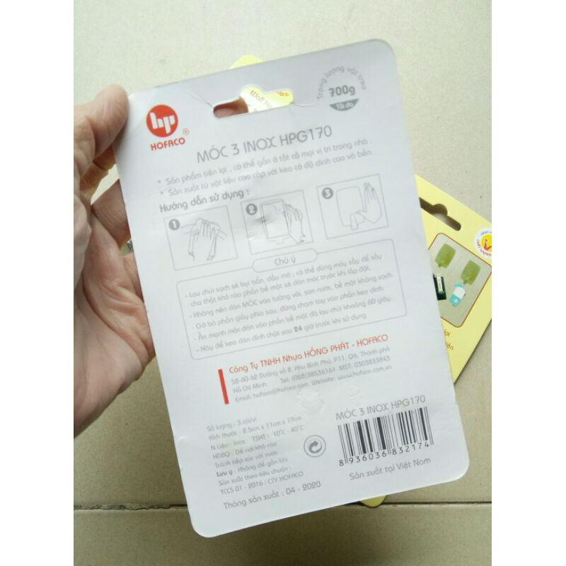Bộ 3 móc dán tường INOX Hofaco với chất liệu siêu bền và trong tải cao 700kg sẽ giúp bạn treo được nhiều món đồ mà không sợ bị gãy hay yếu nhé.- Chất liệu inox cao cấp dày dặn, kiên cố