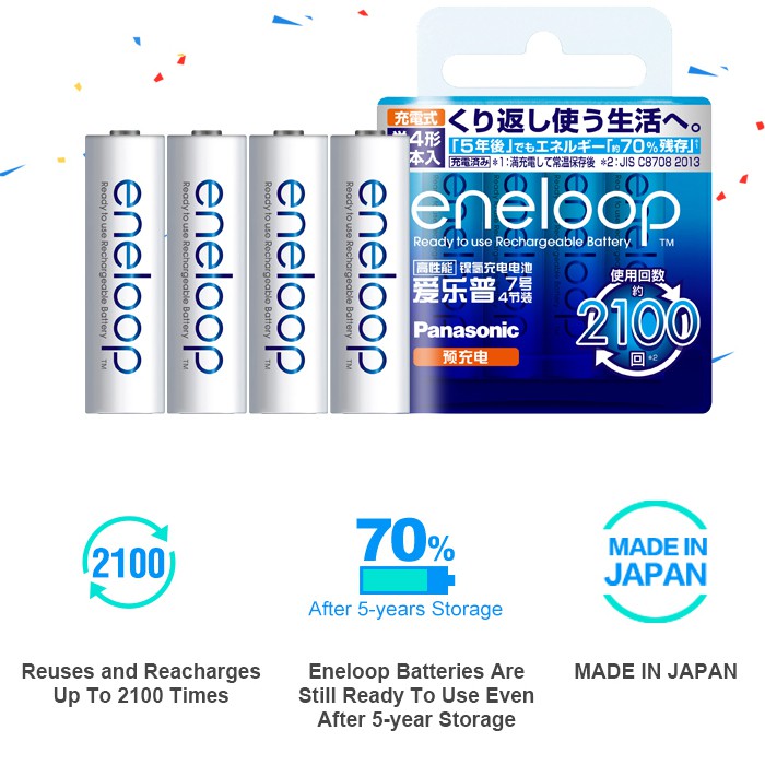 Theo thông tin từ Panasonic, khi sạc đầy, những viên pin Nickel-Metal Hydride AA (mã hiệu HRM03) và AAA (mã HRM6) nhãn hiệu Eneloop thế hệ mới sẽ duy trì năng lượng lên đến 70% khả năng lưu trữ khi ở tình trạng không sử dụng lên đến 5 năm, và nếu không dùng nó trong vòng 1 năm chúng chỉ hao hụt mất 10% năng lượng.
