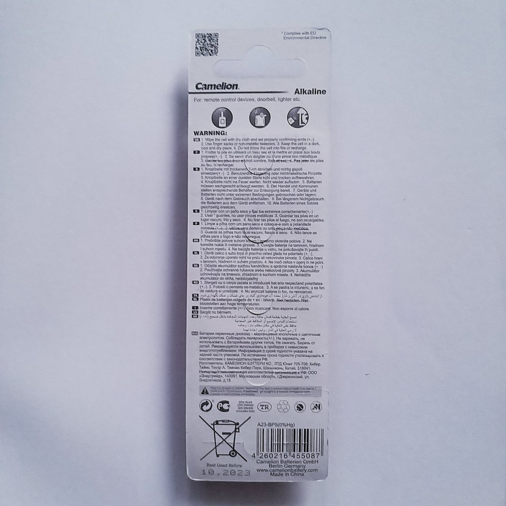 Vỉ 5 viên Pin A23 Camelion 12V thay chìa khóa cửa cuốnLà mẫu pin Chính hãng mới nhất, được sản xuất bởi hãng Camelion - Đức