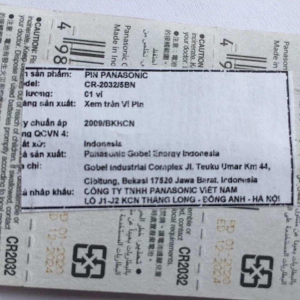 + Mã sản phẩm: CR2032 / CR2025 / CR2016 / CR1632 / CR1632 / CR1216 : 3v Lithium Nhà sản xuất: Panasonic Indonesia -- Ngày sx: Mới nhất , cập nhật liên tục theo lô hàng