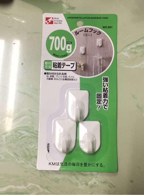 Bộ gồm 3 móc nhựa tải trọng tối đa 700gSử dụng: Với miếng dán chuyên dụng giúp dính móc được lên các bề mặt rất chắc chắn và tiện. Có thể dùng để treo khăn; chìa khoá; móc màn…