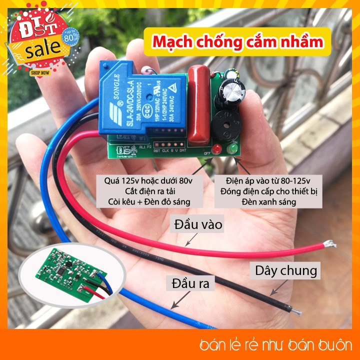 Khi vô ý cắm nhầm sang nguồn điện quá 125v hoặc dưới 80v bo mạch không đóng Role để bảo vệ thiết bị (Còi báo + Đèn đỏ sáng )
