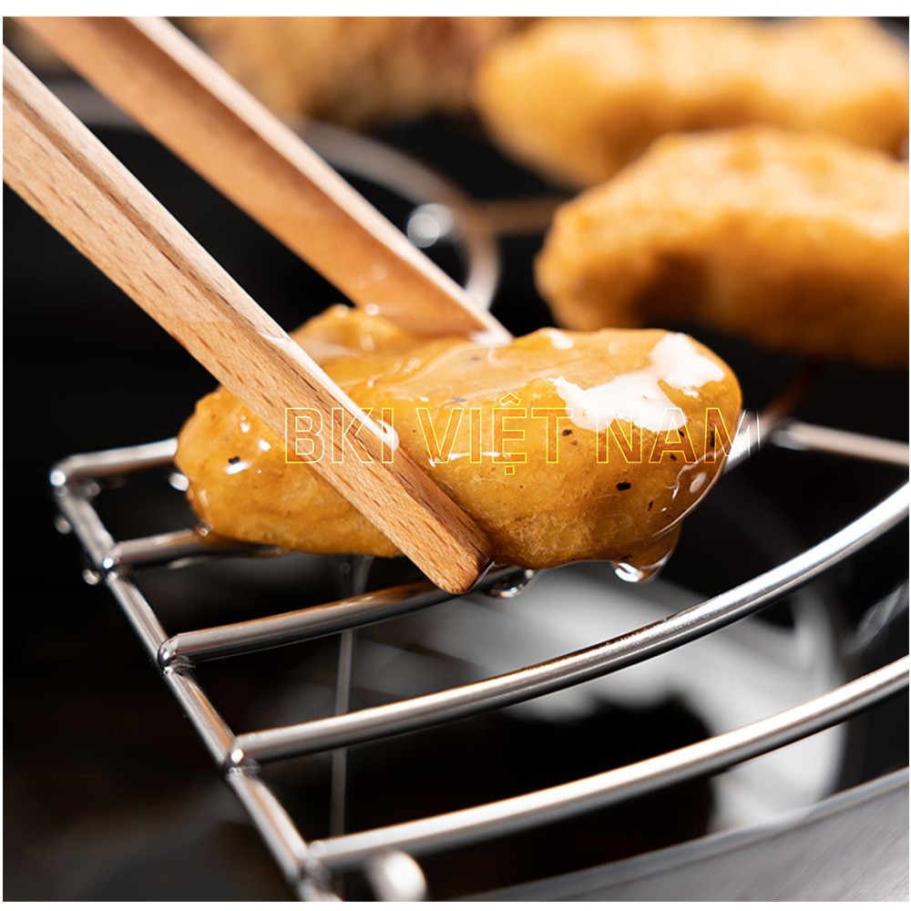 Vỉ với thiết kế thông minh, có 3 chân gác vững chắc trên thành chảo, các thanh inox được uốn tròn để không chiếm diện tích cản trở việc nấu nướng.