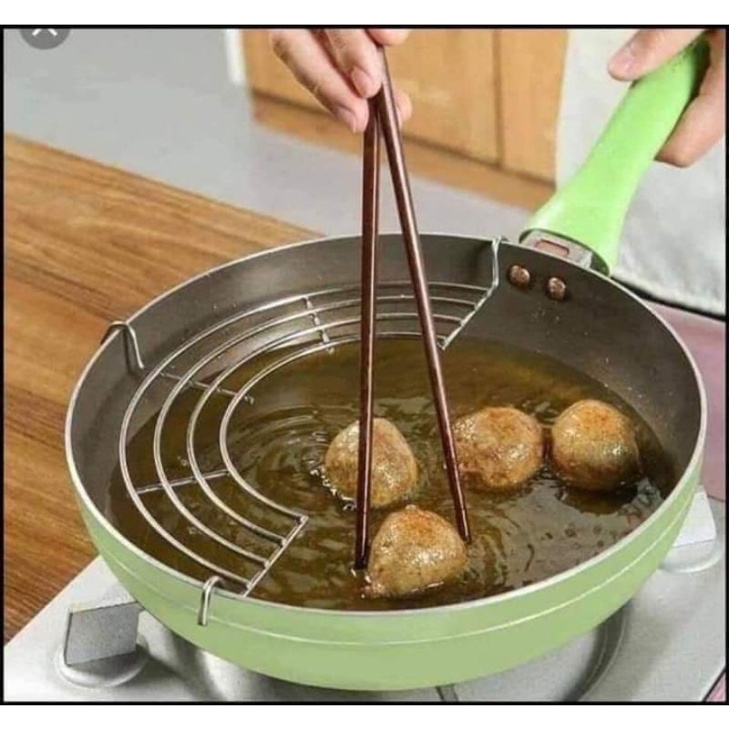 - Vỉ gác chảo chiên, rán dầu mỡ bằng inox dùng để làm khô ráo đồ ăn vừa chiên xong, tận dụng lượng dầu dư thừa.