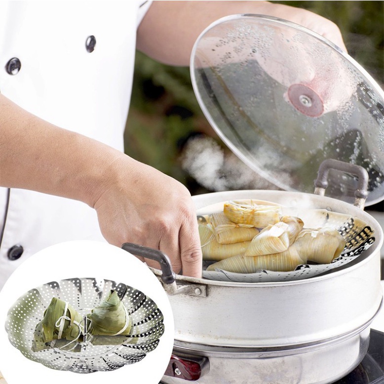 Vỉ Hấp Cách Thủy Inox 304 - Xửng Hấp gấp gọn đa năng tiện lợi dùng đồ xôi - Vỉ hấp xòe có 3 chân gấp gọn inox không gỉ