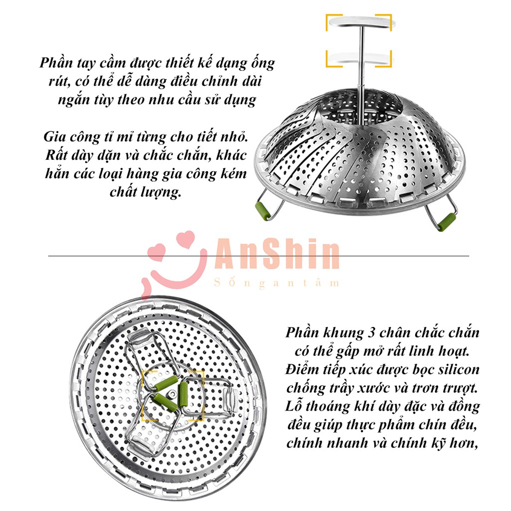 4. Phần chân của vỉ hấp được bọc đệm mút silicon giúp hạn chế sự cọ xát trực tiếp tránh gây trầy xước nổi, chảo, mặt bàn... chống trơn trượt. Ngoài ra, phầm chân được thiết kế di động có thể gấp mở tùy ý rất tiện lợi. Khi không sử dụng chúng ta có thể thu gọn lại tiết kiệm không gian nhà bếp.