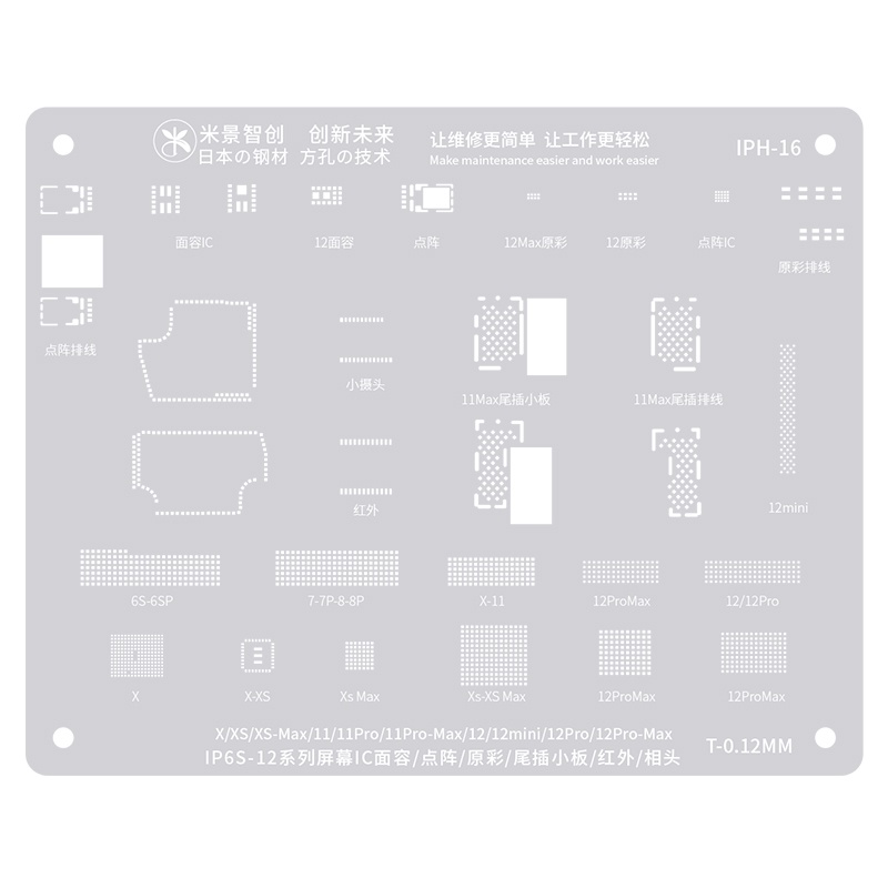 Vỉ làm chân LCD:2 hỗ trợ làm ic màn hình các máy iPhoneVỉ lỗ vuông do Amaoe sản xuất độ dày tiêu chuẩn 0.12mm chất liệu thép chuyên dụng