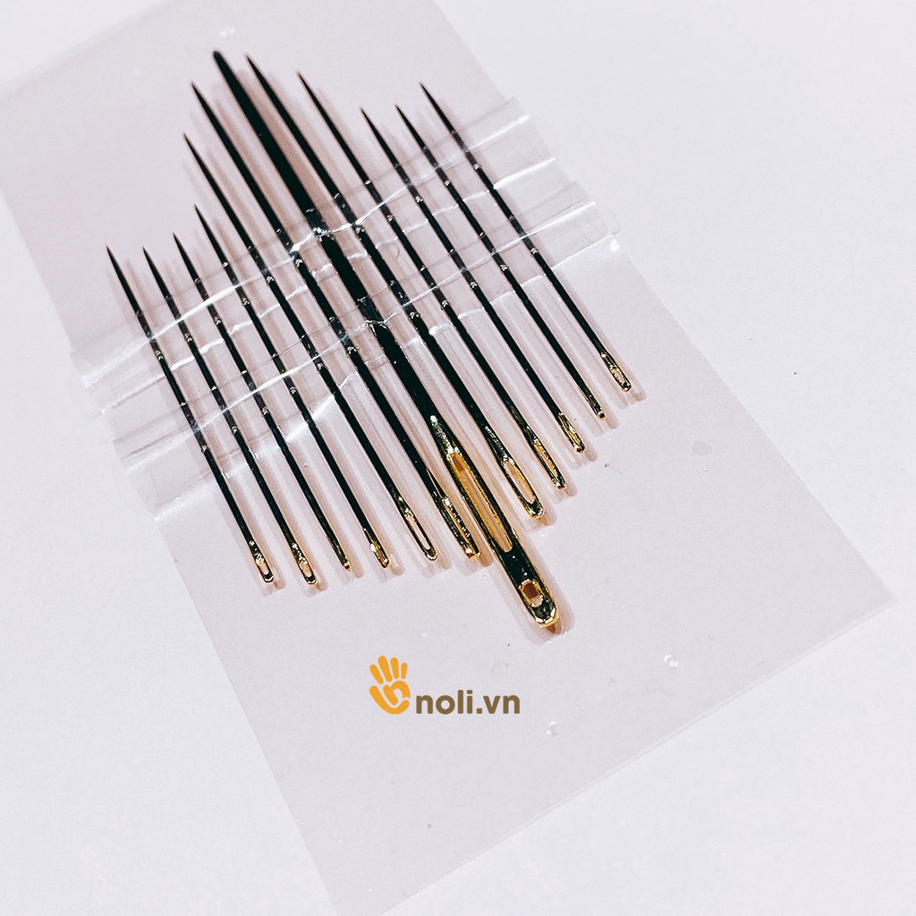 Vỉ kim khâu 12 cây có 1 cây kim khâu đại đầu tù, chị em có thể dùng để khâu ráp thú len. Những size kim khâu nhỏ hơn có thể khâu vải, quần áo vì đầu nhọn. Lỗ xỏ kim màu vàng sang trọng, kim khâu chắc chắn, khó gãy và không rỉ.