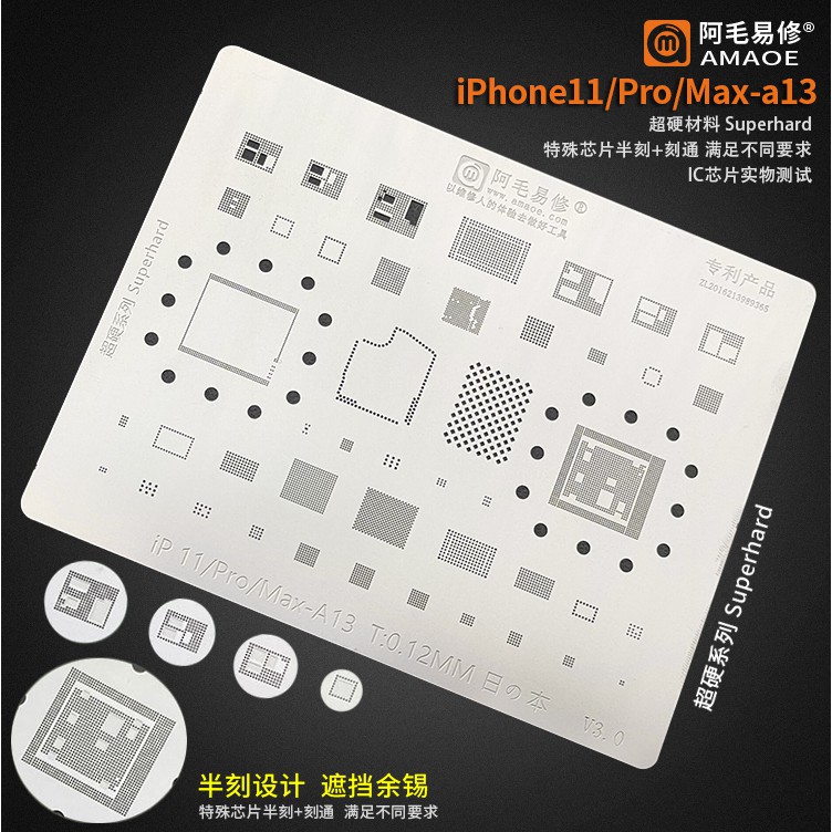 Vỉ làm chân iPhone từ 5 đến 12 Pro Max đủ IC độ dày 0.12mm là loại vỉ rất đáng tin cậy.Bản quyền vỉ của hãng Amaoe chuyên phát triển các loại vỉ và được Relife (Sunshine) phân phối.