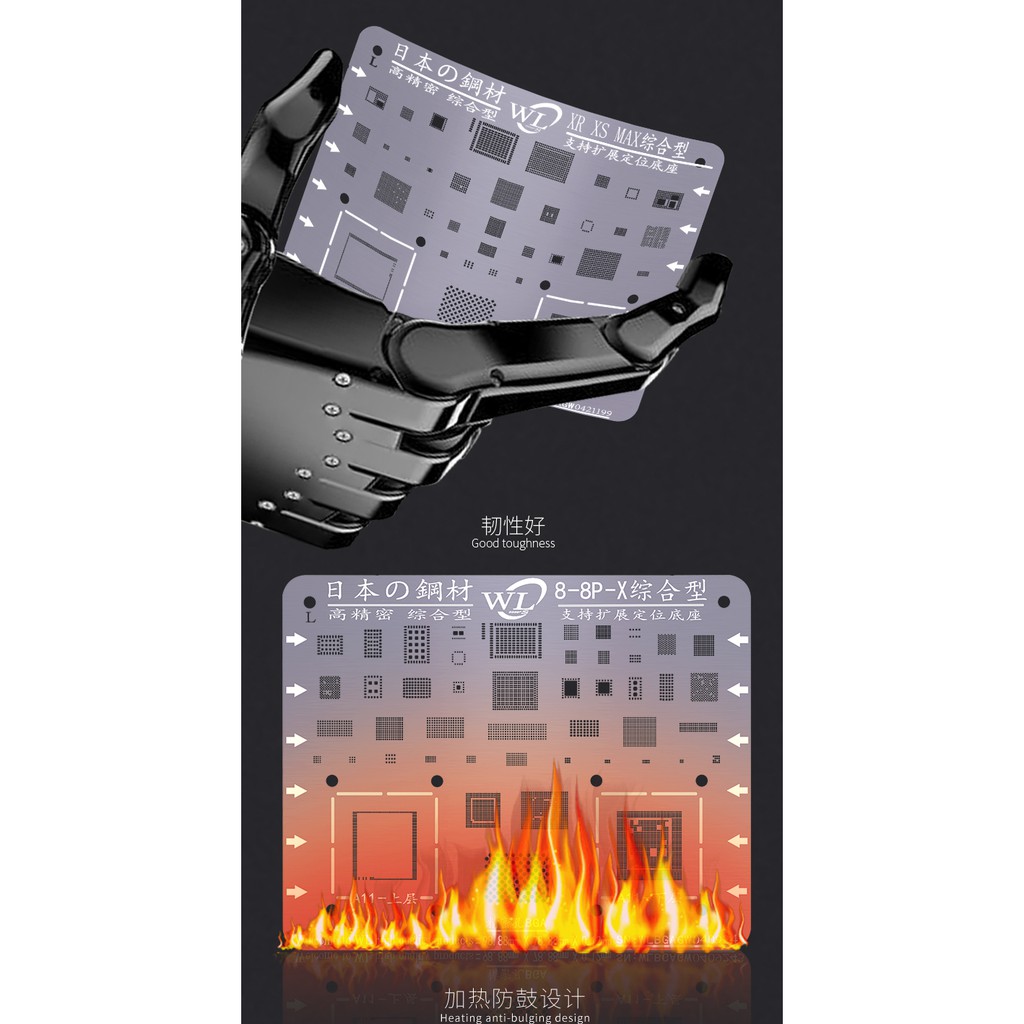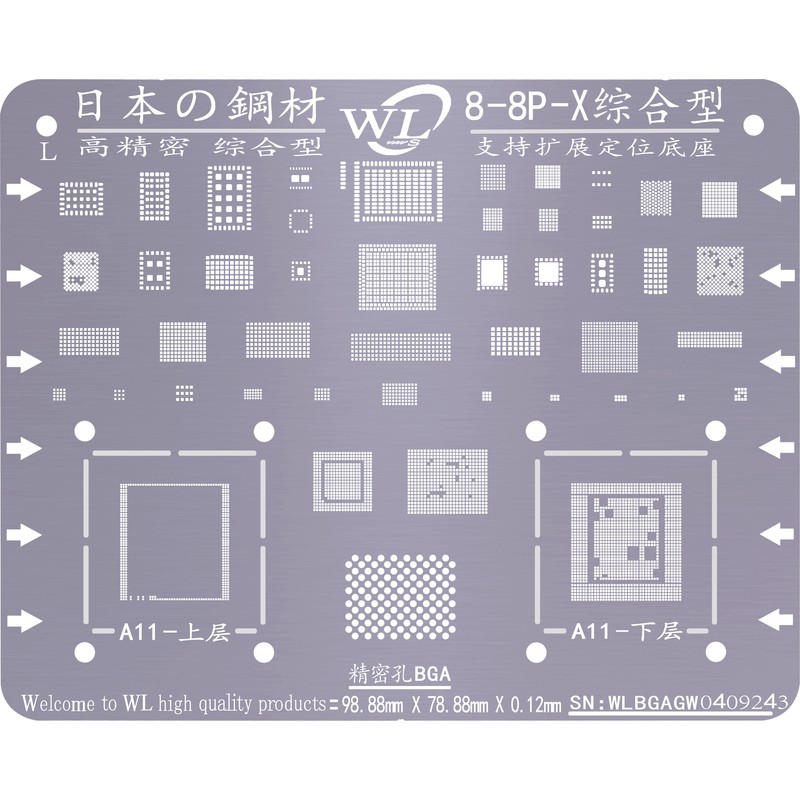 Vỉ làm chân cho iPhone 8/ 8P và X từ hãng WL loại đủ icVỉ làm chân tiêu chuẩn dày 0.12mm, lỗ vuông và độ chính xác cao, dễ thao tác.