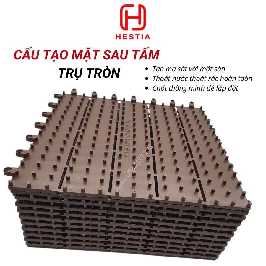 + Mặt dưới của tấm sàn nhựa ngoài trời cũng được thiết kế với các chân tròn chịu lực trải đều bề mặt giúp không bị tắc nghẽn bụi và thoát nước tốt, dễ vệ sinh.