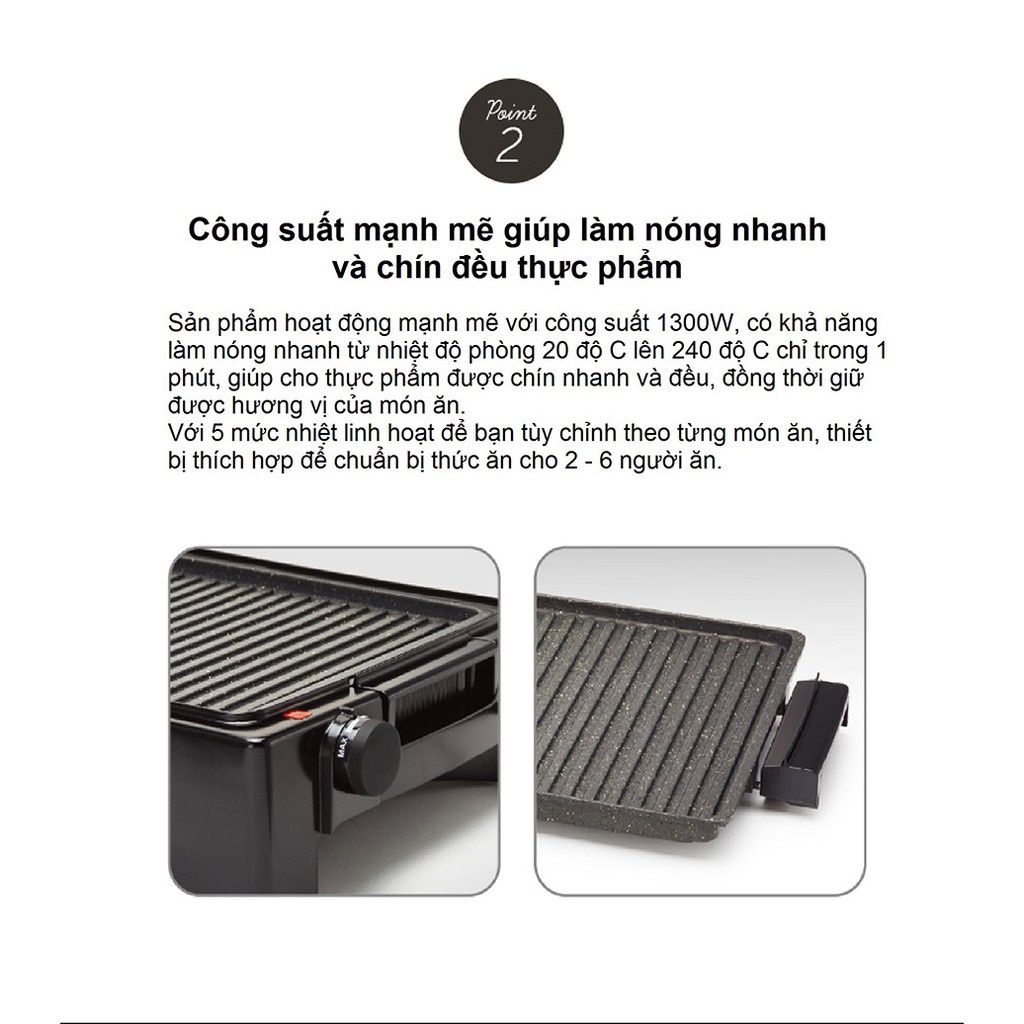 Sản phẩm hoạt động mạnh mẽ với công suất 1300W, có khả năng làm nóng nhanh từ nhiệt độ phòng 20 độ C lên 240 độ C chỉ trong 1 phút, giúp cho thực phẩm được chín nhanh và đều, đồng thời giữ được hương vị của món ăn. Với 5 mức nhiệt linh hoạt để bạn tùy chỉnh theo từng món ăn, thiết bị thích hợp để chuẩn bị thức ăn cho 2 - 6 người ăn.