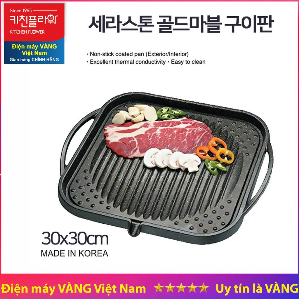 🔵 Vỉ nướng Hàn Quốc Kitchen Flower Cerastone 30x30cm:- Dùng để nướng thực phẩm tươi sống.