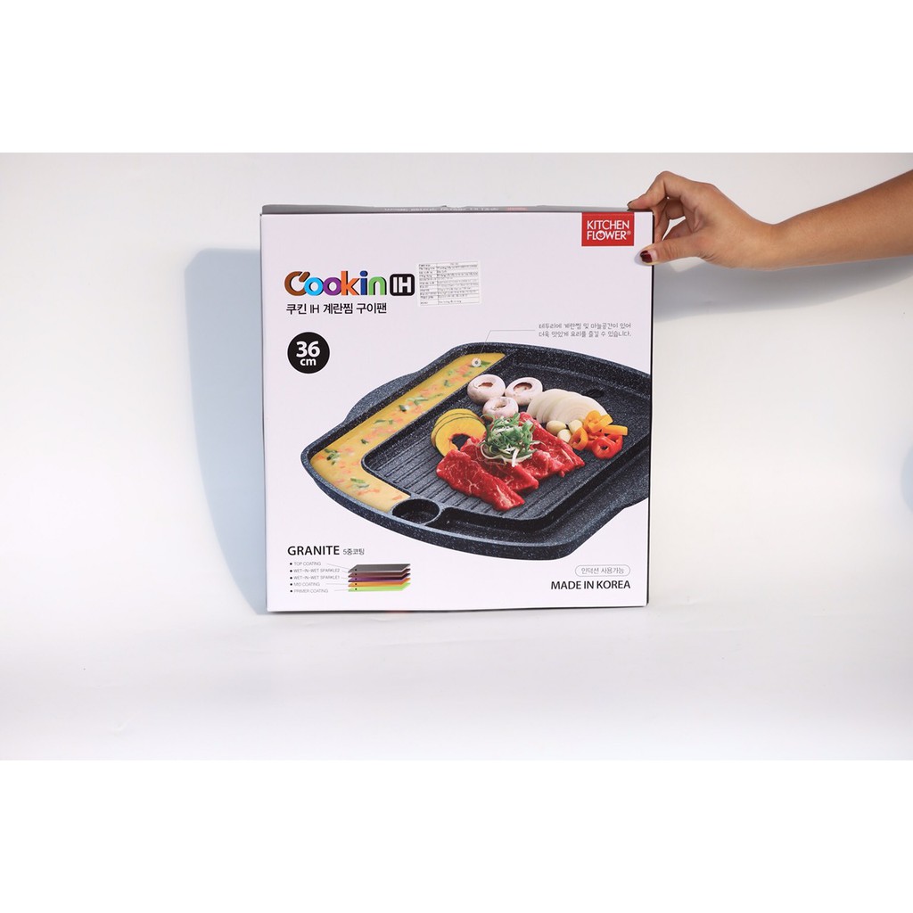 Vỉ nướng chống dính Hàn Quốc dùng đun trên bếp từ, bếp ga,bếp cồn ,bếp hồng ngoại.Tất cả các loại bếp đều có thể sử dụng đượcThương hiệu Kitchen flower COOKIN IG-360