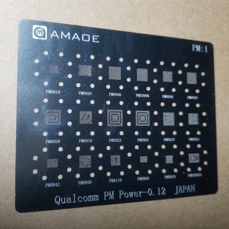 Vỉ làm chân IC nguồn Qualcomm PM1Các ic nguồn hỗ trợ gồm: PM8018, PM8926, PM8996, PMI8996, PM8956, PM8941, PM8508, PM8916, PM8922, PM8921, PM8917, PM8953, PM8841, PM8909, PM8110, PM8004, PM8019, PM820EAD