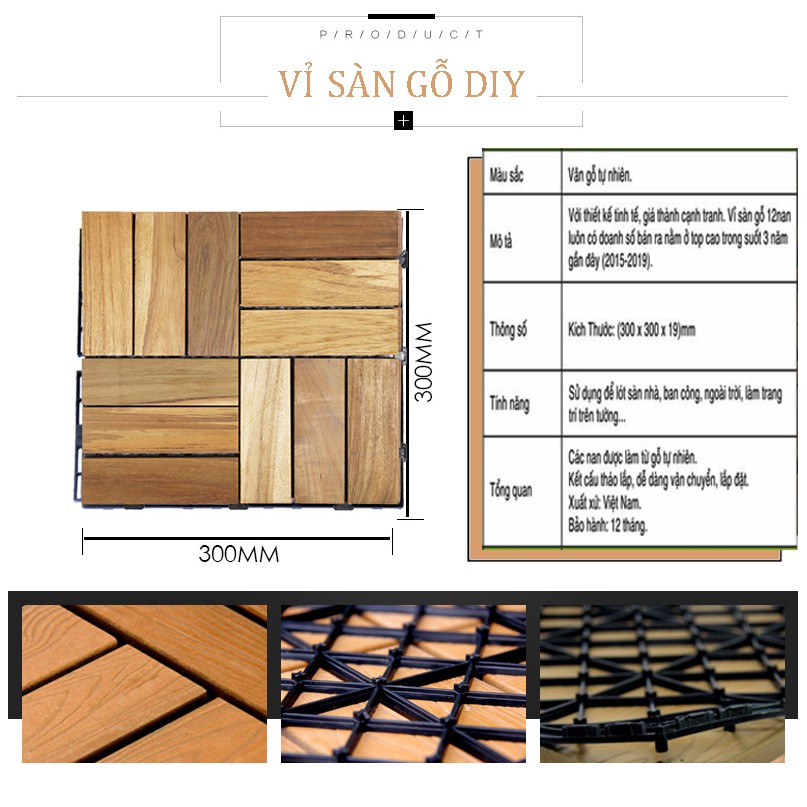 VÁN SÀN GỖ TỰ NHIÊN NGOÀI TRỜI - SÀN GỖ VỈ NHỰA BAN CÔNG SÂN VƯỜNSàn gỗ tự nhiên vỉ nhựa là sản phẩm thiết kế sáng tạo, các nan gỗ được gắn trên một vỉ nhựa tạo lên viên gạch kích thước 30 cm x 30 cm. Tấm sàn gỗ được lắp đặt một cách dễ dàng nhờ hệ thống khóa liên kết của vỉ nhựa. Ở Việt Nam, sản phẩm đang trở thành xu hướng mới sử dụng cho ban công căn hộ chung cư và tiểu cảnh sân vườn. Vỉ sàn gỗ Scũng rất phù hợp để làm sàn ngoại thất cho hành lang, bể bơi hay phòng tắm, sauna tắm hơi với chi phí thấp.