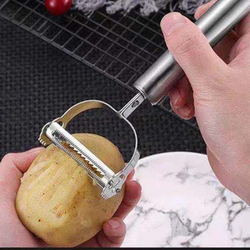 - Chất liệu thép thiết kế vừa tay cầm và lưỡi dao mảnh sắc, dụng cụ bào cắt rau củ sẽ giúp bạn dễ dàng lột vỏ nhiều loại trái cây và củ quả một cách nhanh chóng với độ thẩm mỹ cao, tiết kiệm thời gian tối đa.