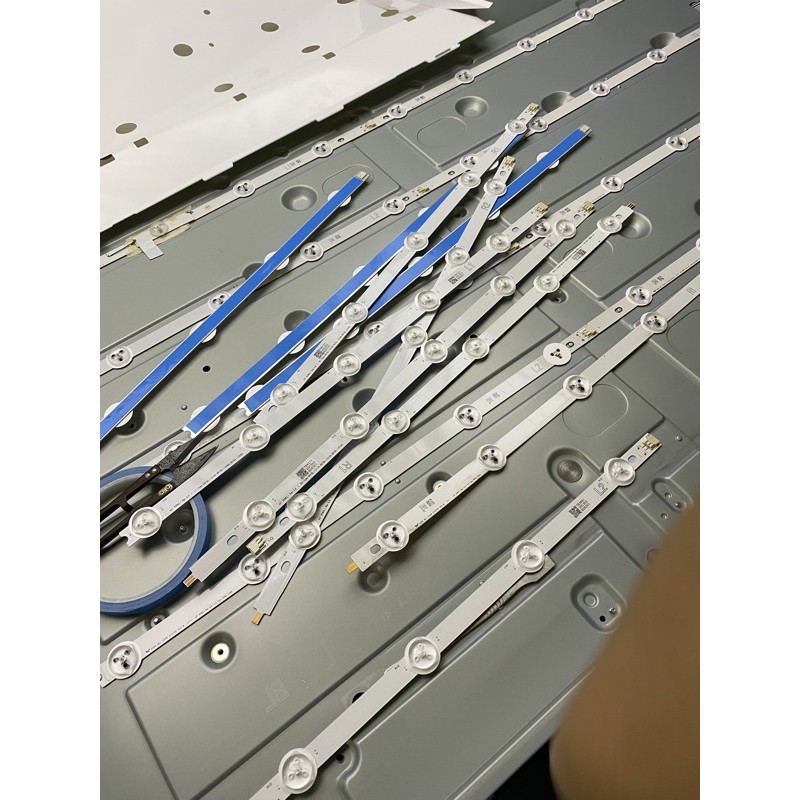 + Đo lượng băng keo vừa bằng thanh led bạn đang có, dán vào thanh led sau đó gỡ lớp màu xanh ra và dán lên mâm tivi (như hình trên).