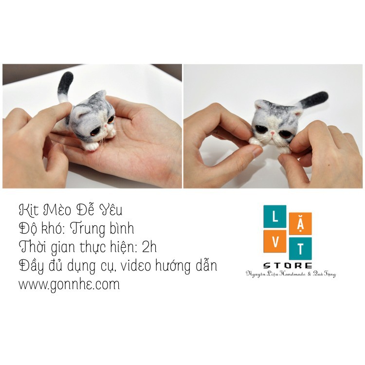 - Làm len chọc có khó không? Thực hiện Kit len chọc này có khó không là câu hỏi mà mình thường xuyên được các bạn hỏi. Các bạn chỉ cần có khoảng 20-30 phút để làm quen với việc cầm cây kim và thực hiện sản phẩm. Từ đó bạn sẽ có cảm giác len chọc và chọc rất dễ. So với các kit Tân Binh Shiba thì Kit len chọc Mèo này có độ khó cao hơn 1 xíu, do các bạn cần tỉ mỉ hơn, sử dụng việc chồng màu sắc lên các bé mèo. Gắn mắt bự và râu cho các bé mèo