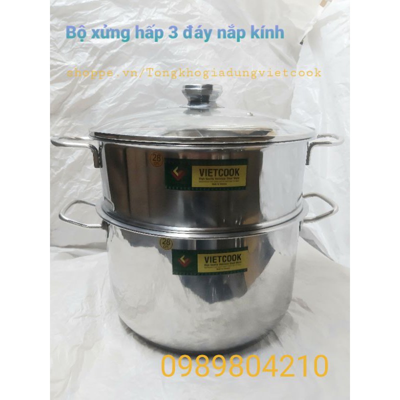 (Video SP)Bộ nồi xửng hấp inox ,xửng hấp inox 2 tầng 3 đáy nắp kính,nắp inox VietCook đun bếp từ size 24,26,28,30,32