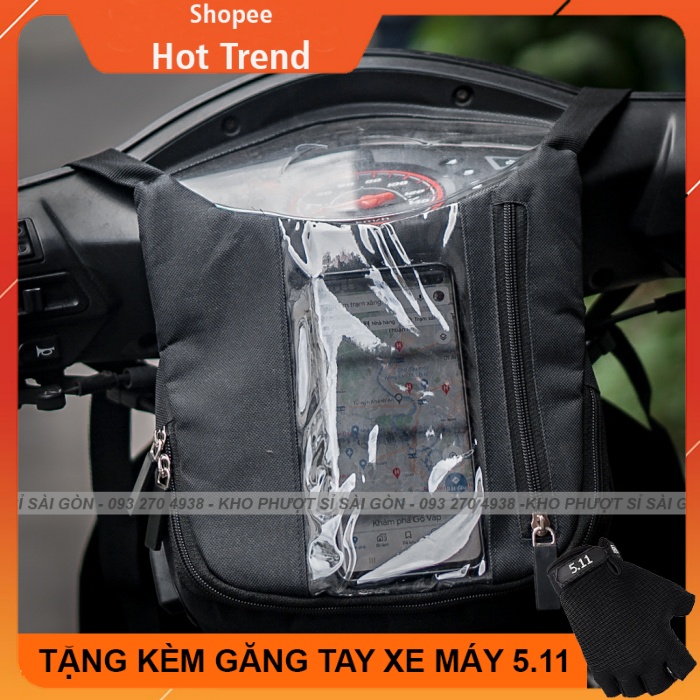 [Có VIDEO TEST CẢM ỨNG] Túi treo đầu xe máy Grab chiều dọc đựng điện thoại và găng tay xe máy 5.11 màu đen co giãnCOMBO sản phẩm túi treo đầu xe và găng tay xe máy 5.11