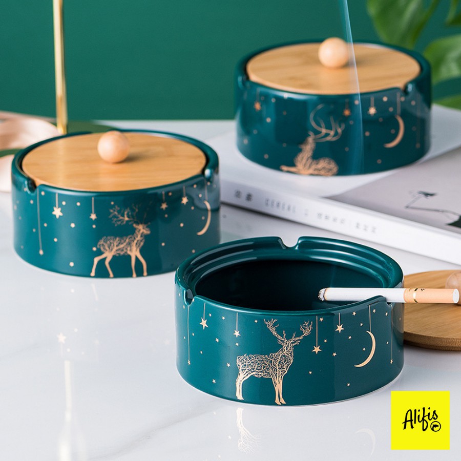 [Video thật] Gạt tàn thuốc, gạt tàn thuốc lá sứ xanh cổ vịt kèm nắp gỗ phong cách Bắc Âu