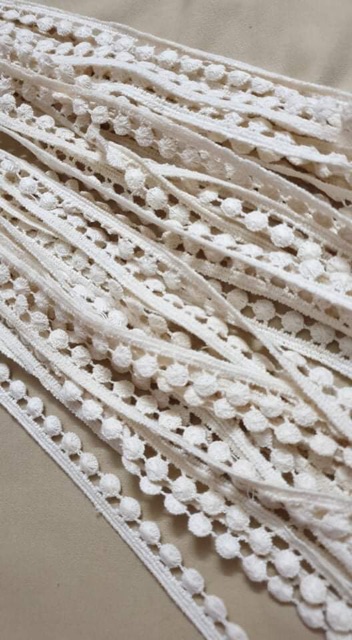 Viền pompom cotton bản 1,2cm, màu ngoài trắng ngà vàng hơn ảnh chút khách nhéChất cotton 100%, mềm đẹp, không co giãn